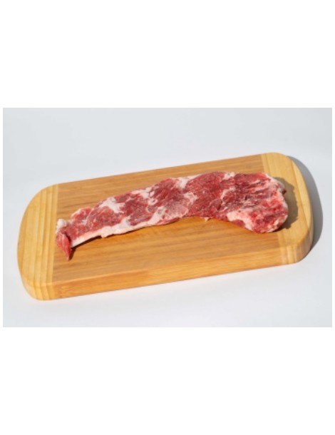 De forma triangular y textura infiltrada, la pluma es un corte de músculo ligero situado junto a la presa. Su alto grado de infiltración de grasa intramuscular le aporta un veteado característico que, al cocinarse, se funde suavemente, logrando una carne extremadamente jugosa, aromática y de sabor persistente.